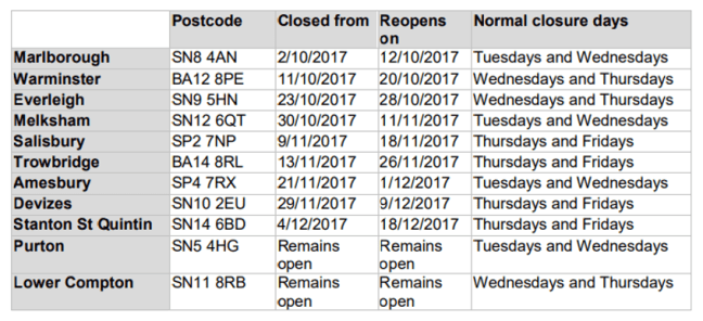 Household recycling centre refurbishment programme The current contract for the management of Wiltshire’s household recycling centres with Hills Waste Solutions ends in October 2017. The council invited tenders for this service to ensure best value for Wiltshire residents, and awarded a contract to FCC Environment for the management of nine household recycling centres owned by … Continue reading Recycling Centres close for refurbishment