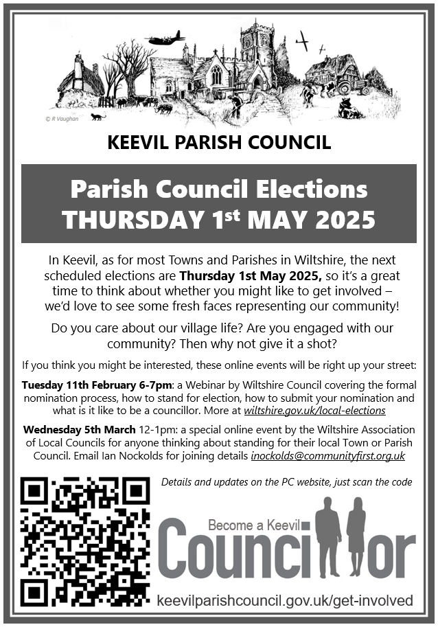 Local council elections happen every four years and are taking place this May, so there has never been a better time to get more involved with village life – we’d love to see some fresh faces representing our community! See keevilparishcouncil.gov.uk/get-involved/ for more information, or talk to Sarah (Clerk) or any of the current councillors…