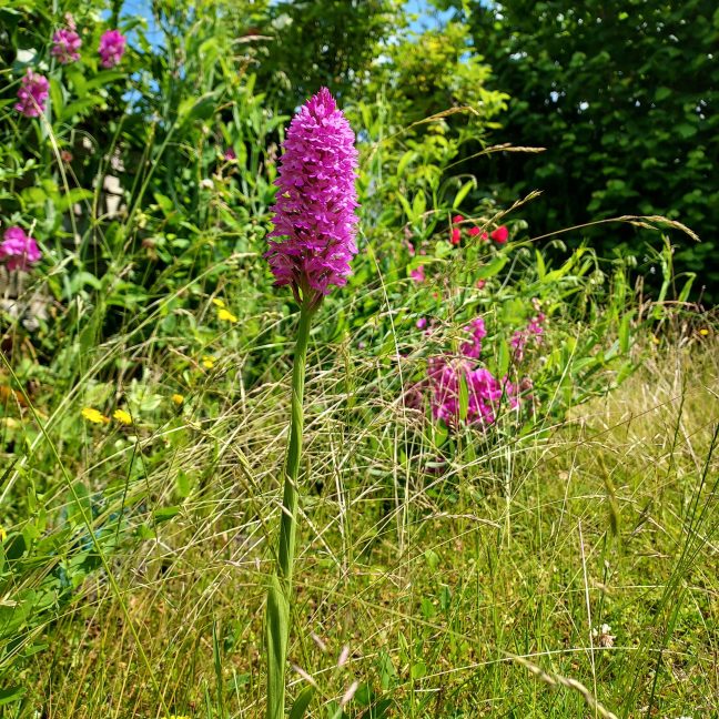 This pyramidal orchid was observed on the front lawn of the Raseys’ garden last May. They were observing a ‘No Mow May’ and plan to do it again this year. How about locking up your lawnmowers from 1st May to give the wild flowers in your lawn a chance to bloom? More details can be found at plantlife.org.uk.