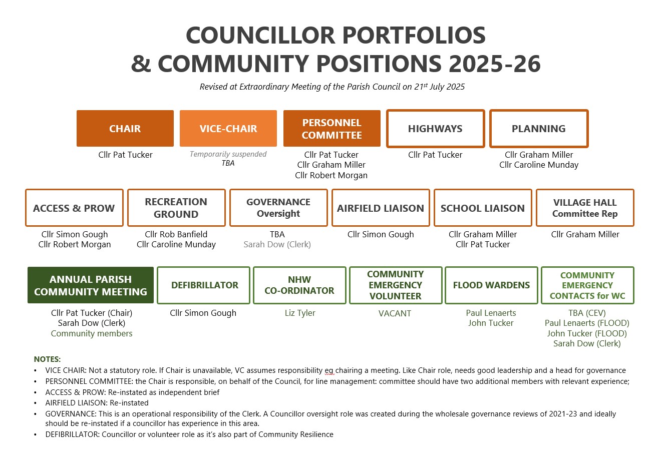 Responsible for Public Rights of Way (PROW), School liaison, and sits on the Personnel Committee.