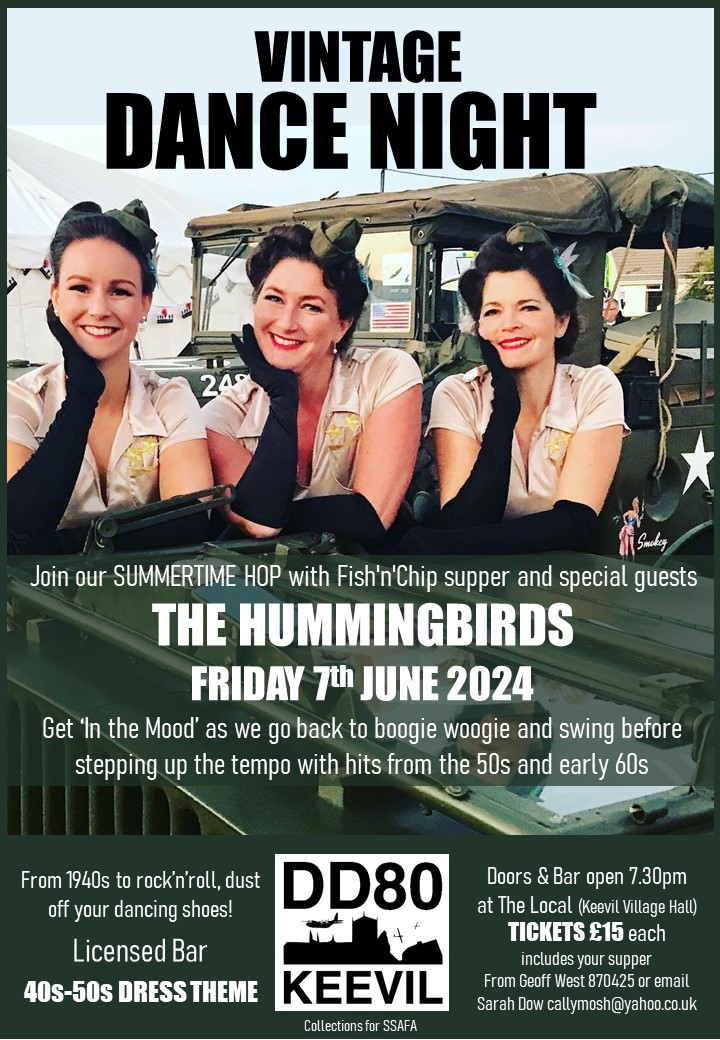 Everyone is also welcome at our vintage DANCE NIGHT in the village hall on Friday 7th but you will need a ticket! With a Fish ‘n’ Chip supper and special guests the HUMMINGBIRDS, we’ll be getting In The Mood as we revisit the good old days of boogie woogie Bugle Boys of Company B, big band and swing, before stepping up the tempo with old favourites from the 50s and early 60s. Dust off those dancing shoes and get ready to enjoy a night of classic oldies that kept the dance halls and Locals full from 1940s wartime through to rock ‘n’ roll! Themed dress optional 😉 Here’s a little demo…