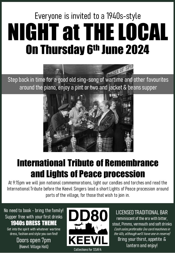Make sure you pop into THE LOCAL on Thursday evening, it’s open to all, no need to book – it’s going to be a truly special night, with singalongs of wartime favourites around the piano, plus lincensed bar, a jacket ‘n’ beans supper (free with your first bar purchase) before the reading of the International Tribute at 9.15pm and the Lights of Peace procession for those that want to join it. Feel free to come in 1940s dress if you feel like it! Oh, and a big thank you to the Three Daggers for supporting us with some lovely ale!